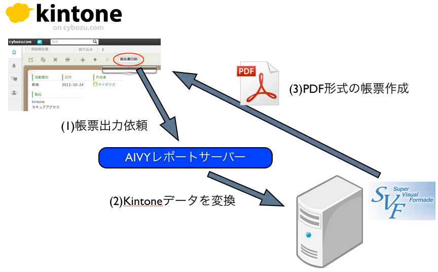 PDF作成のボタンが押されるとkintone上のデータが「AIVYレポートデザイナー・ブリッジ」に送られ、データ変換された後に「SVF for PDF」にデータが渡され、「SVF for PDF」で生成されたPDFがご利用のブラウザに表示されます。